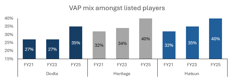 VAP mix for all these players have increased to ~35-40% over the years and this has led to their margins increasing as well (ranging from 1.5-3%) owing to the better mix towards high margin dairy products.
