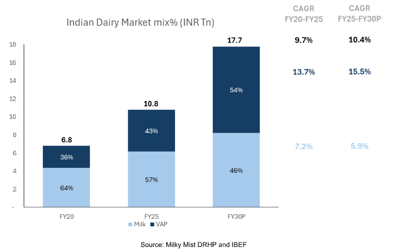 India’s packaged food market is undergoing a structural shift driven by changing consumer lifestyles. The category has expanded from ~₹8.7 trillion in FY20 to ~₹14.2 trillion in FY25 (10.3% CAGR) and is expected to reach ~₹23.6 trillion by FY30, growing at ~10.7% CAGR. Within this, milk and milk-based value-added products (VAP) form the largest segment, accounting for ~76% of the overall market.